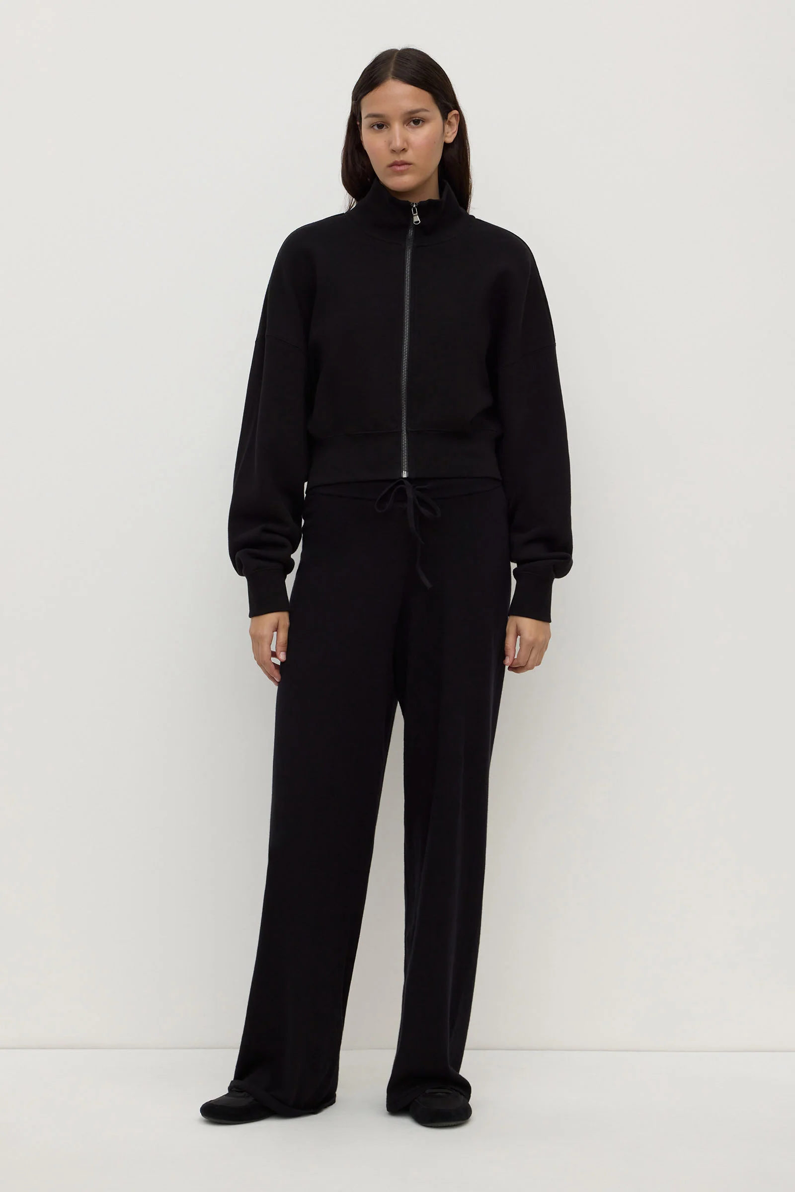 The Cotton Cashmere Lounge Pant in black is a relaxed leg pant with a covered elasticated waistband and waist tie, crafted from a soft cotton cashmere blend.