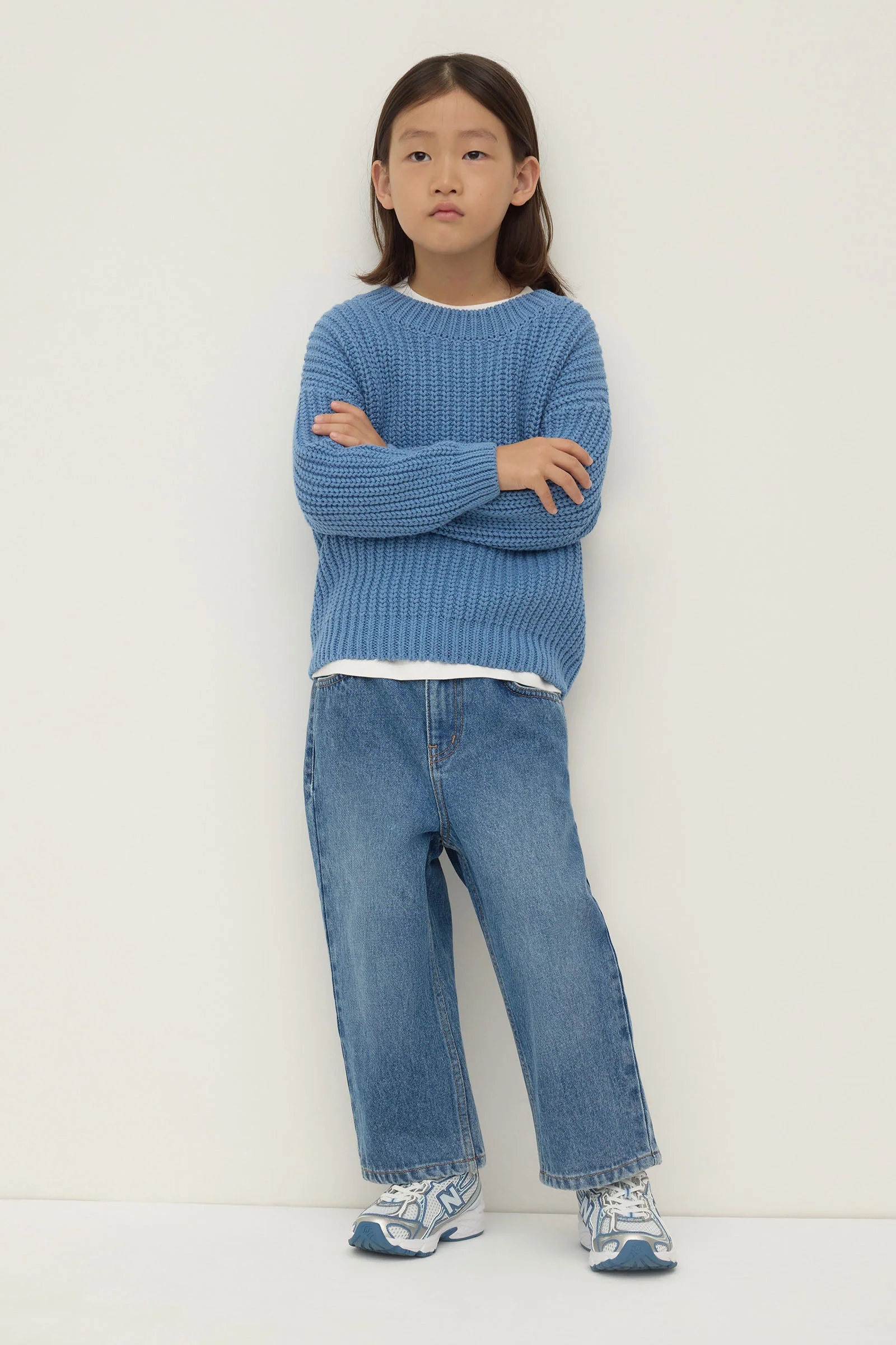The Kids Unisex Forster Knit in drift is a 100% cotton relaxed crew neck knit with ribbed cuffs and hem.