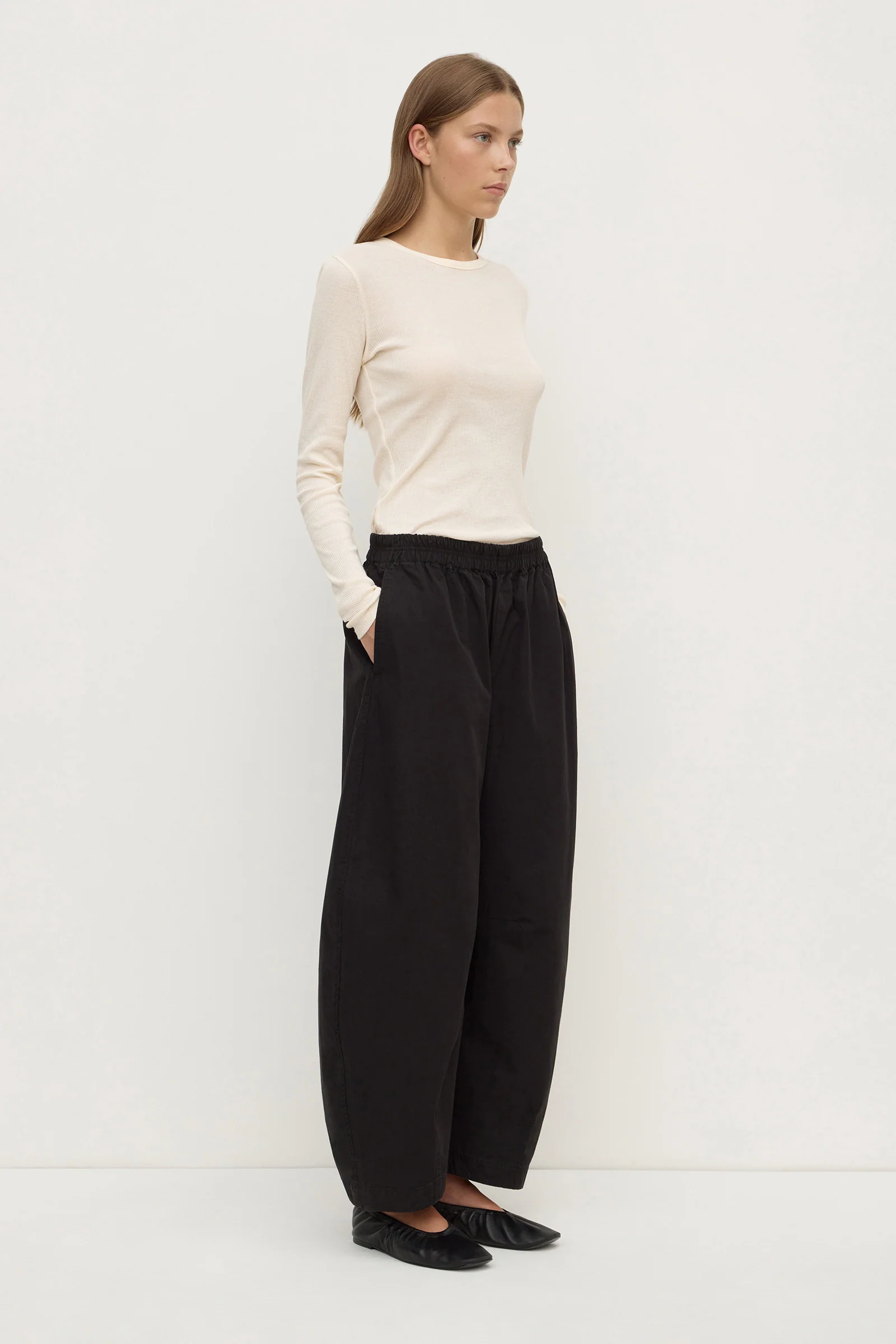 The Lola Barrel Leg Pant in black is a 100% cotton voluminous leg pant that flares at the knee and tapers at the ankle.