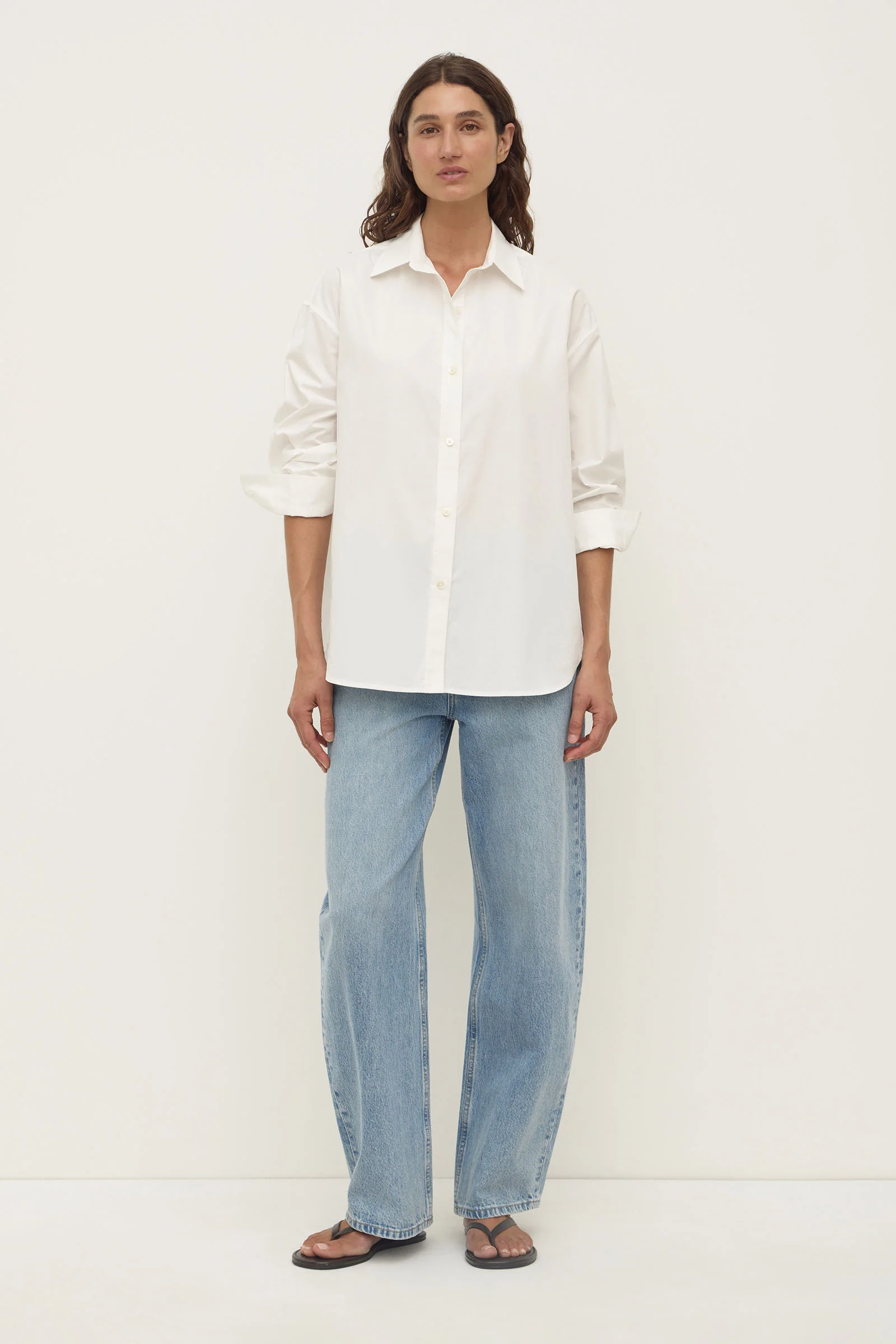 The Marigold Poplin Shirt in white is a longline 100% cotton shirt with a relaxed fit, shaped hem, single-button cuffs, and double yoke pleat detail.