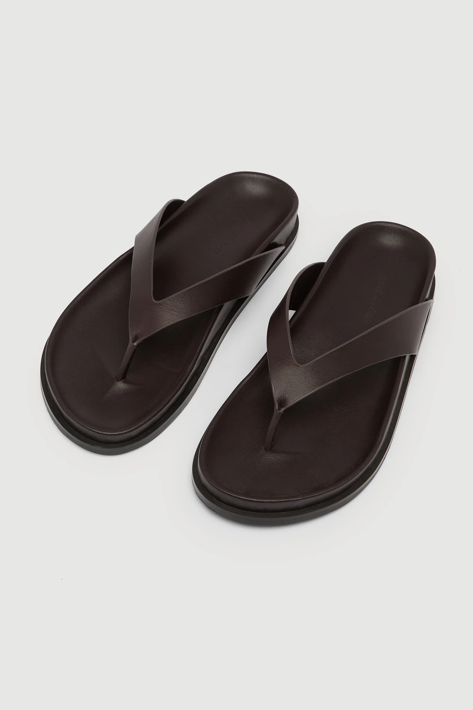 Minimal leather thong featuring sleek straps, designed for day-to-night wear.